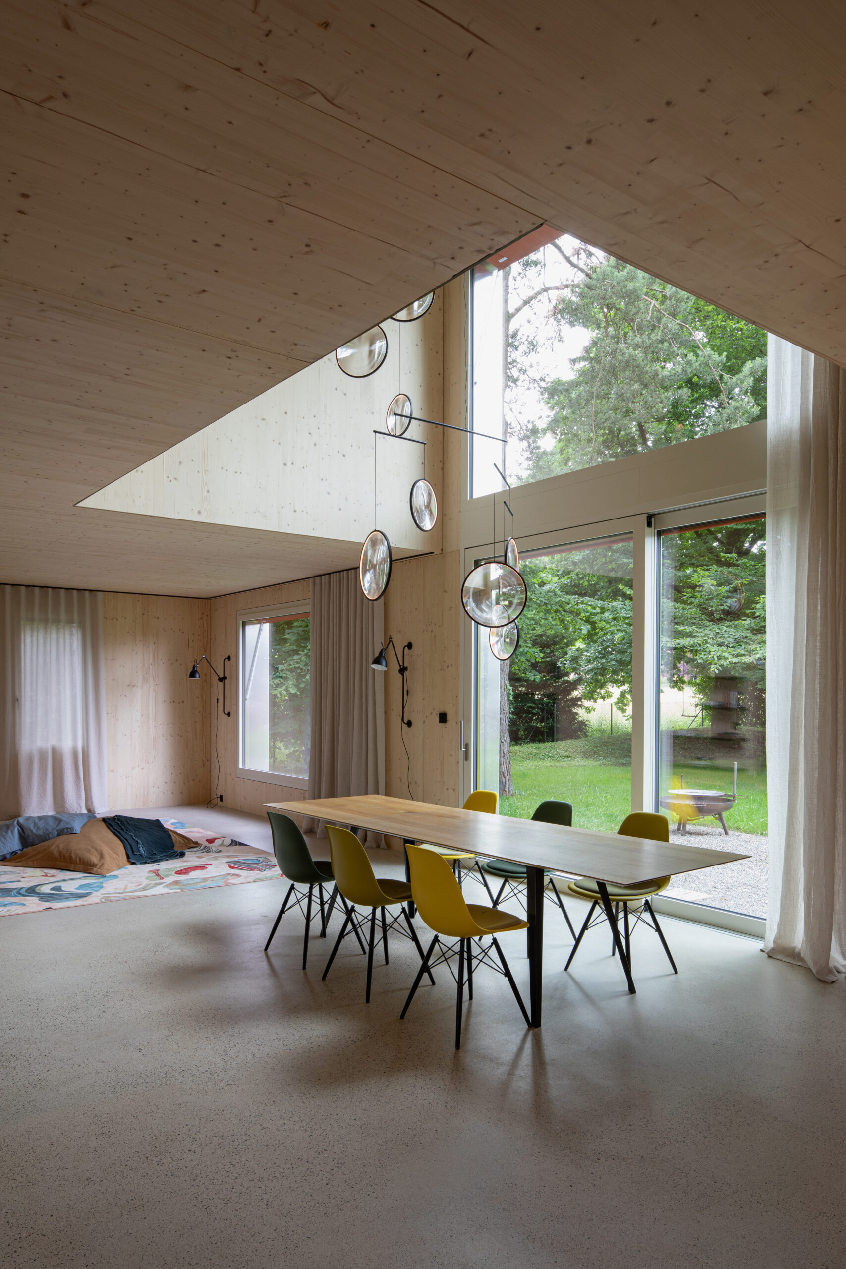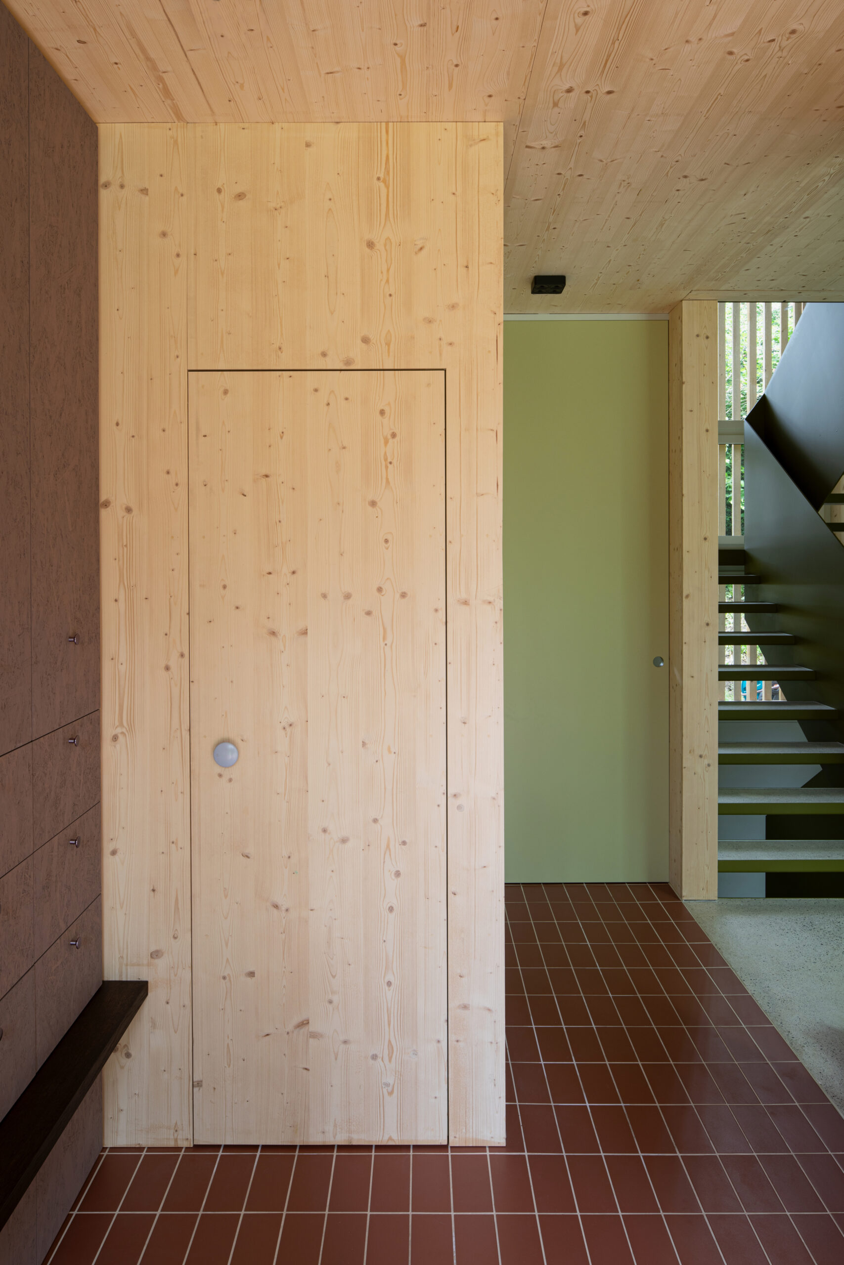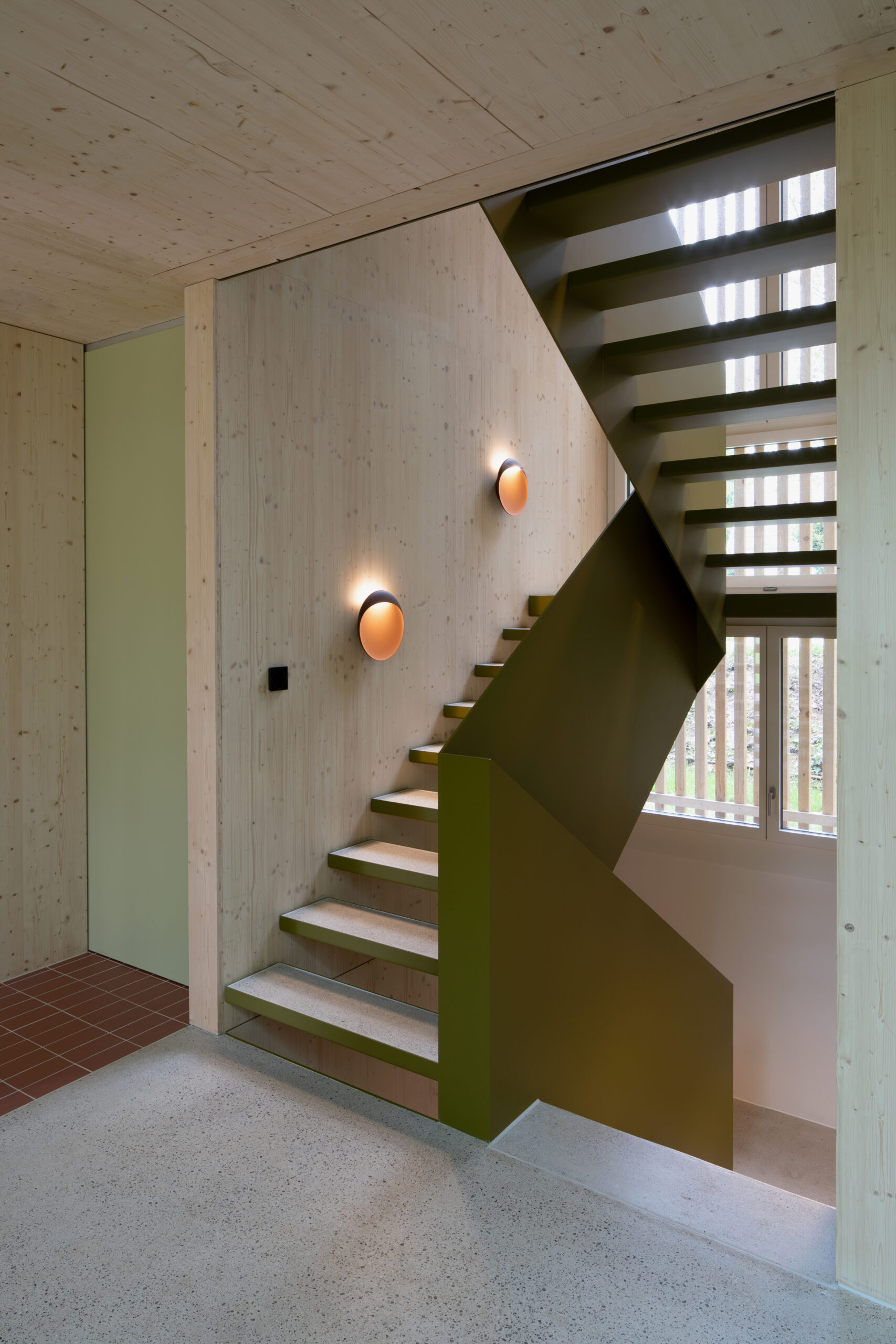 Natürliche Materialien, roter Klinker, weisser Zementboden mit buntem Rheinkies und farbig lasierte Einbaumöbel prägen den Charakter des Hauses. Ergänzt wird das Raumangebot durch ein separates Spielzimmer, einen zweiteiligen Eingangsbereich sowie private Rückzugsräume im Ober- und Untergeschoss.