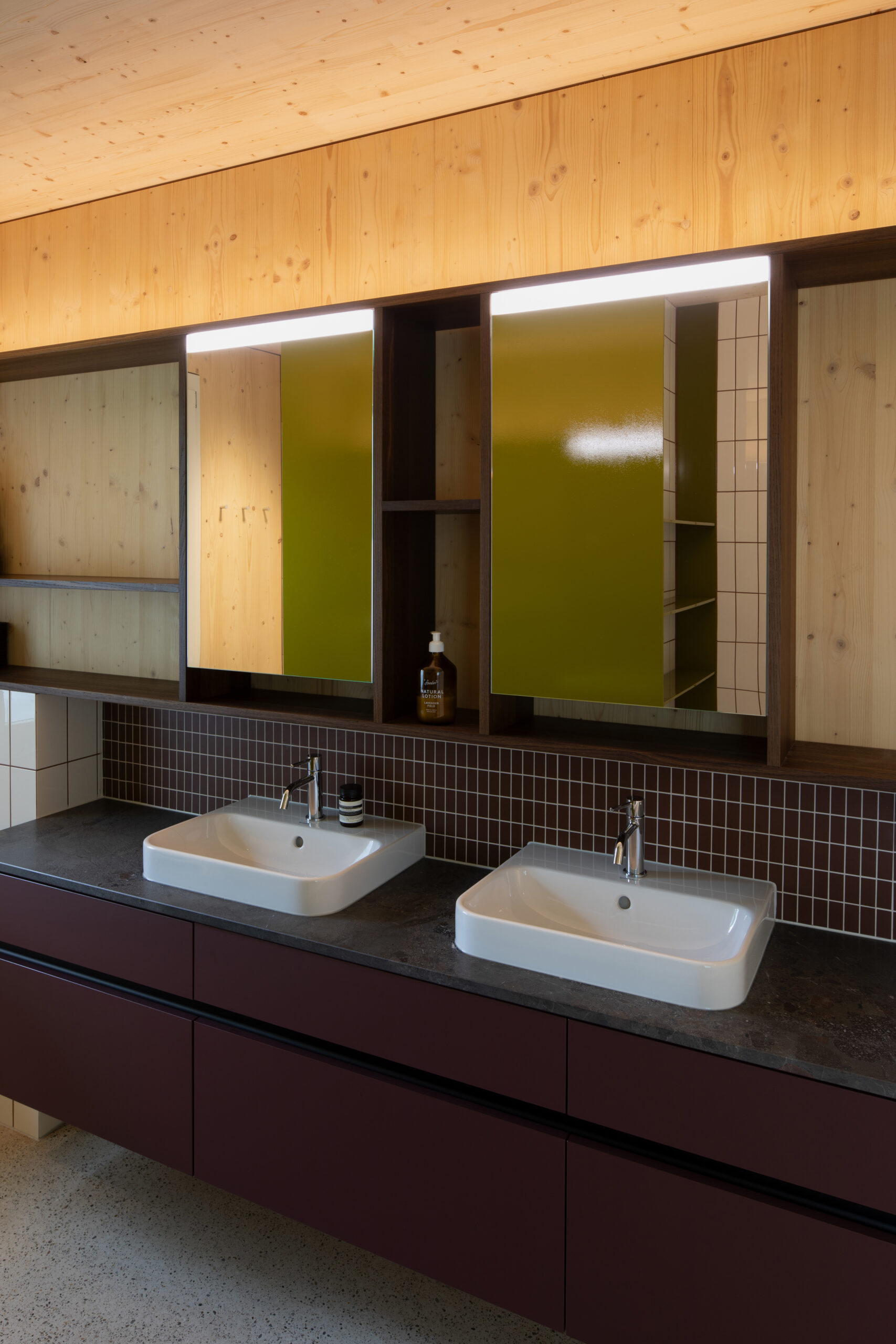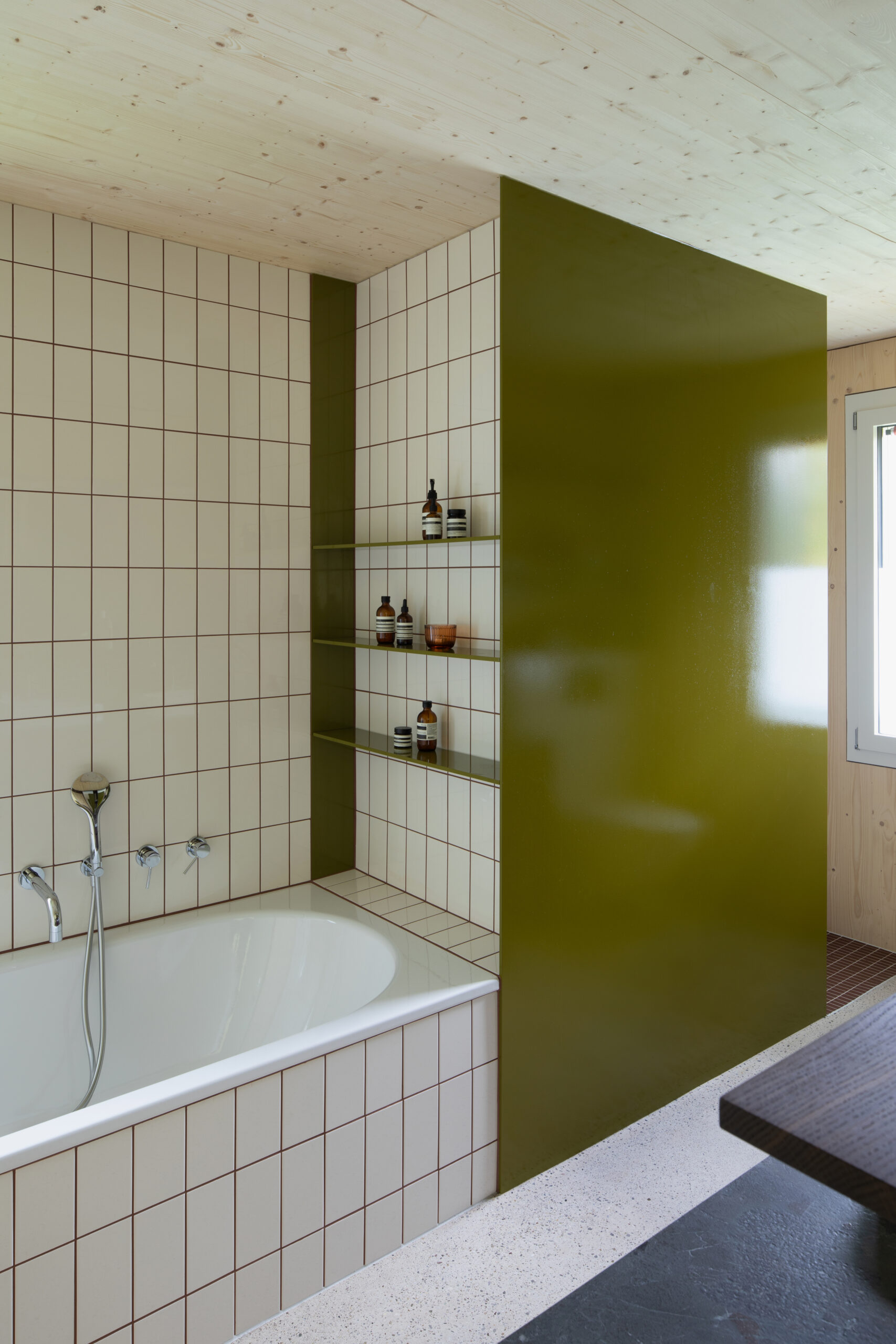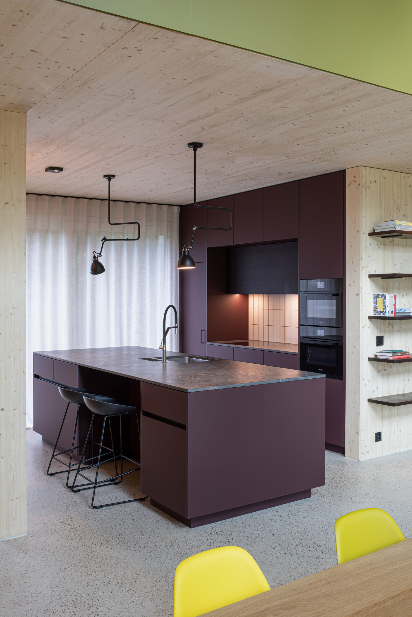 Natürliche Materialien, roter Klinker, weisser Zementboden mit buntem Rheinkies und farbig lasierte Einbaumöbel prägen den Charakter des Hauses. Ergänzt wird das Raumangebot durch ein separates Spielzimmer, einen zweiteiligen Eingangsbereich sowie private Rückzugsräume im Ober- und Untergeschoss.