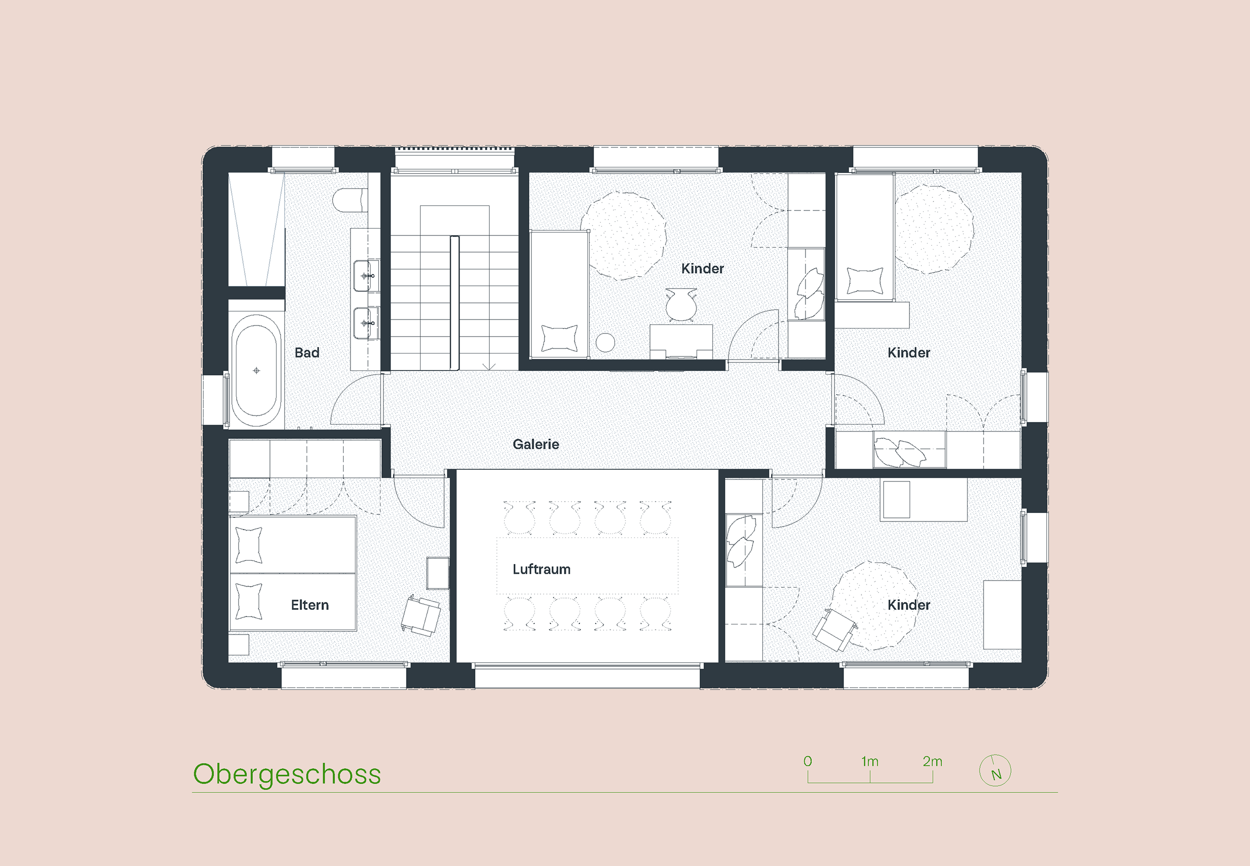 Die klar zonierten Grundrisse schaffen Ordnung und Orientierung, ohne die Grosszügigkeit einzuschränken. Zentrale Räume wie der überhohe Essbereich unter der Galerie oder die grosszügig platzierte Kücheninsel laden zum Zusammensein ein und geben dem Alltag eine Bühne.