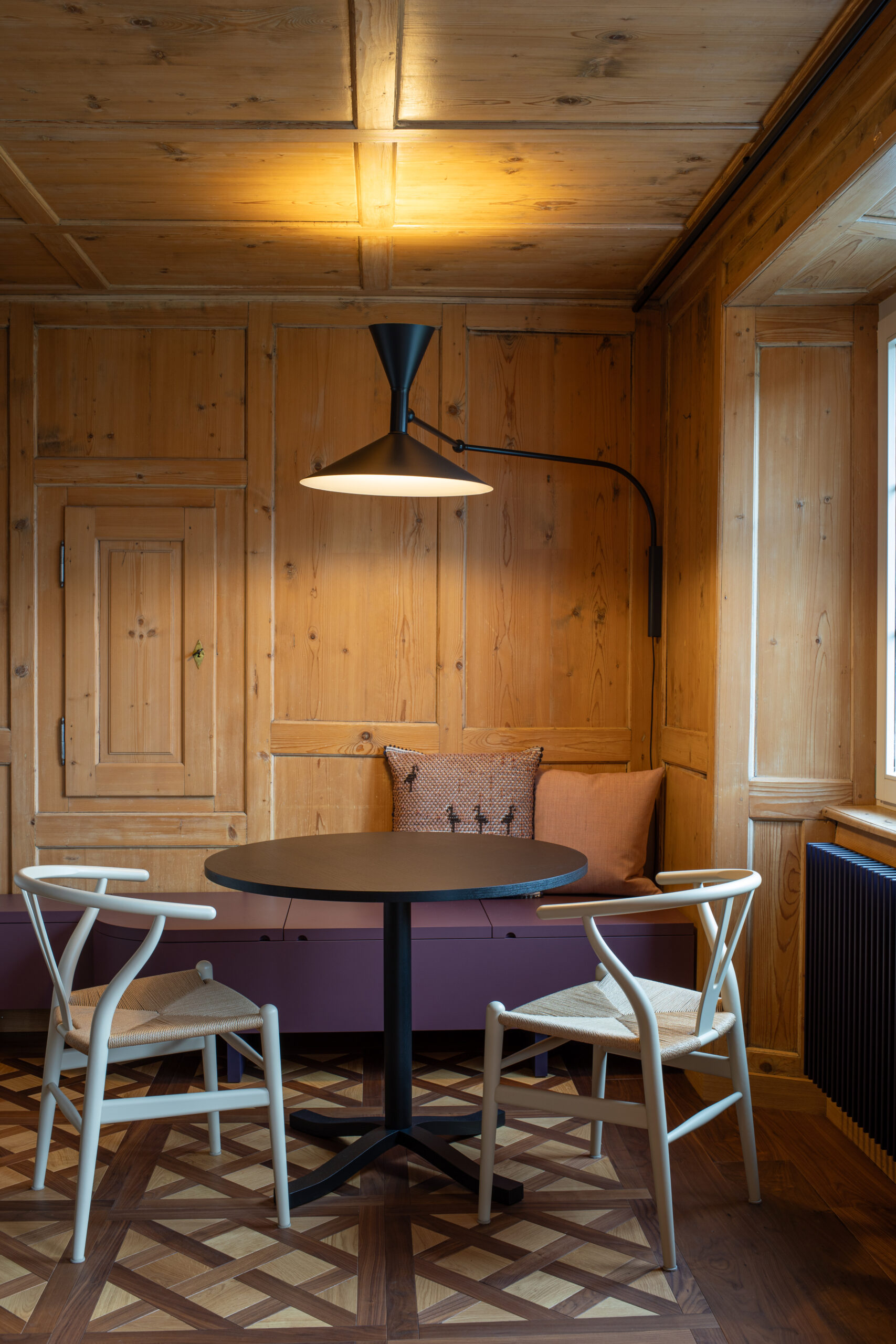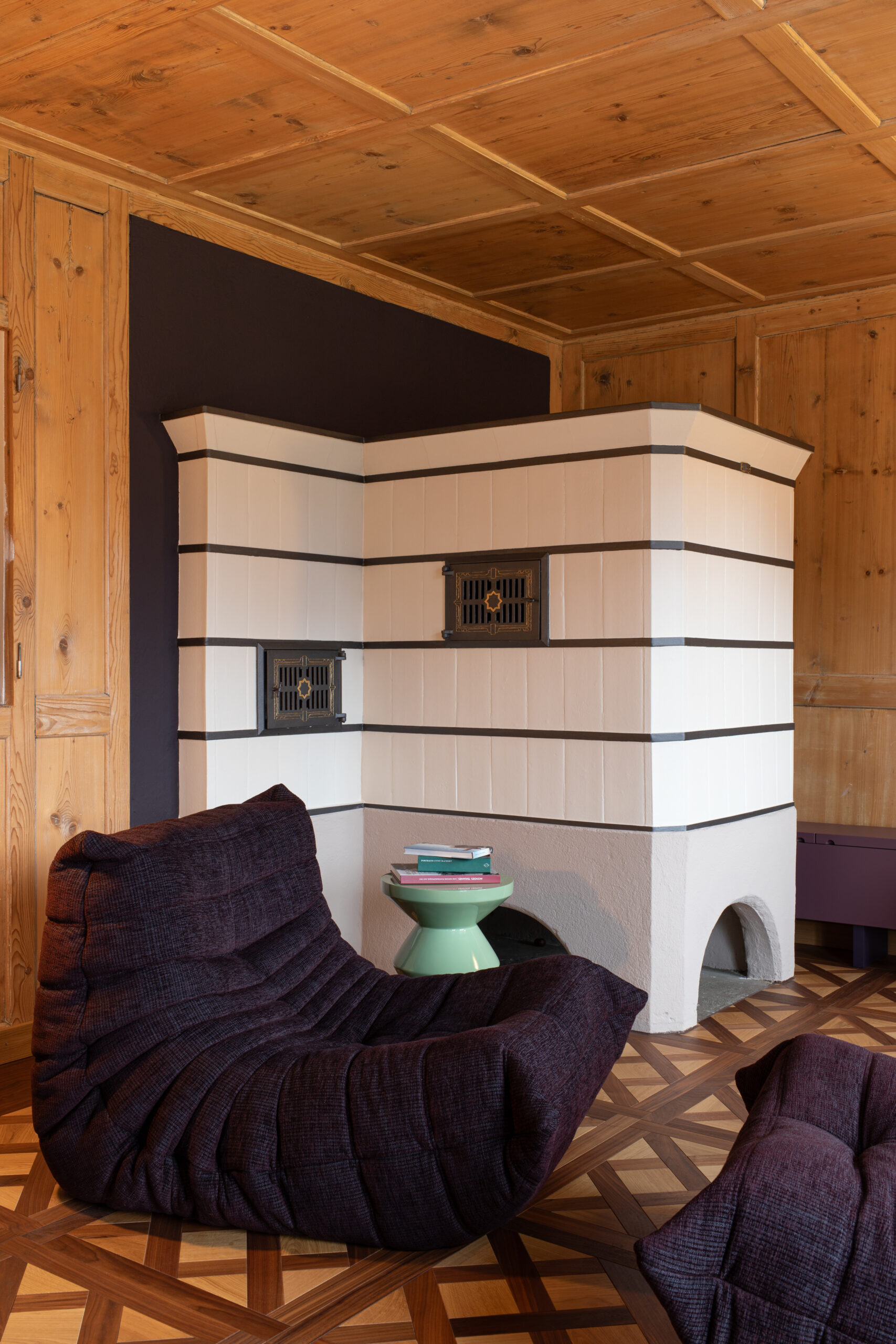 Das Gestaltungskonzept verwandelt die ursprüngliche Stube und Zustube in einen modernen frischen «Living Room». Die historische Raumhülle, bestehend aus Boden, Wand und Decke, wollten wir bewahren. Die Bodenhöhe wurde wieder auf das historische Niveau gebracht, und der neue Belag wurde so gewählt, dass er sich nahtlos in die Geschichte des Hauses einfügt. Bestehende Elemente wie der Ofen und das Holztäfer wurden mit Sorgfalt saniert und liebevoll herausgearbeitet.