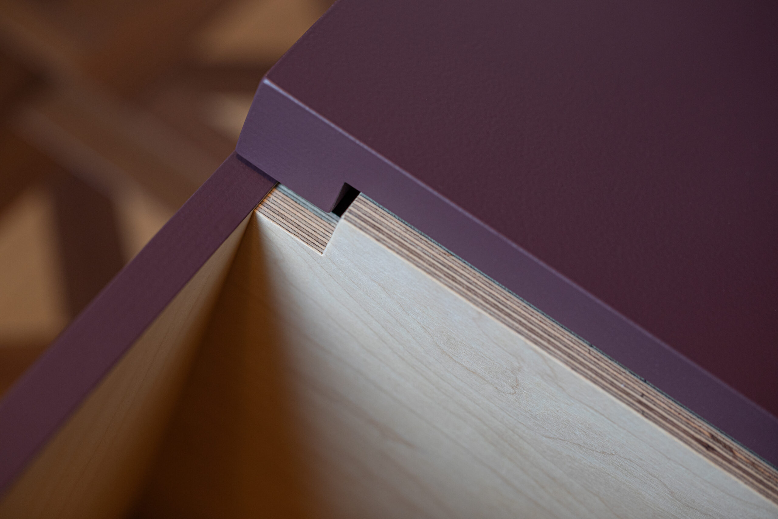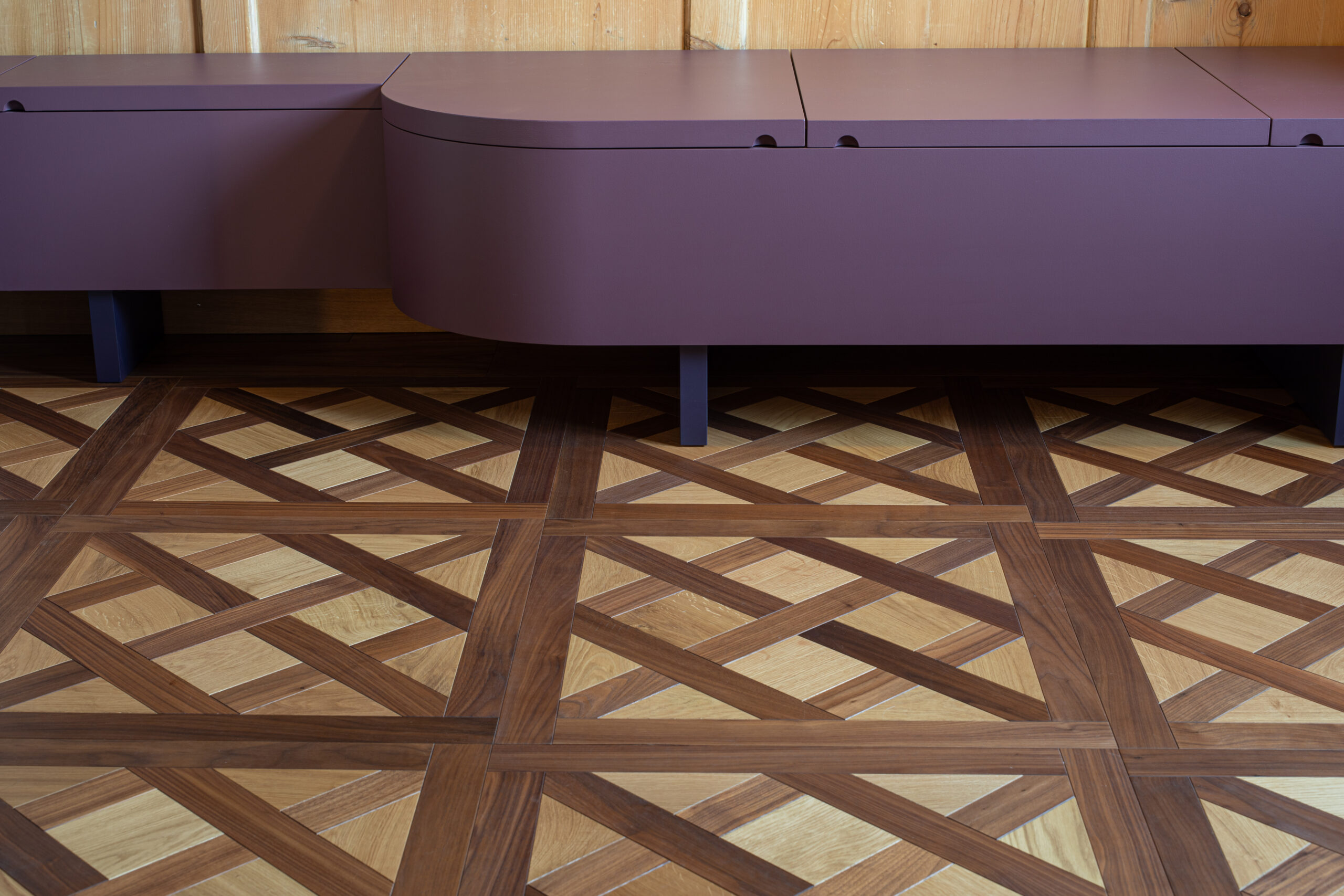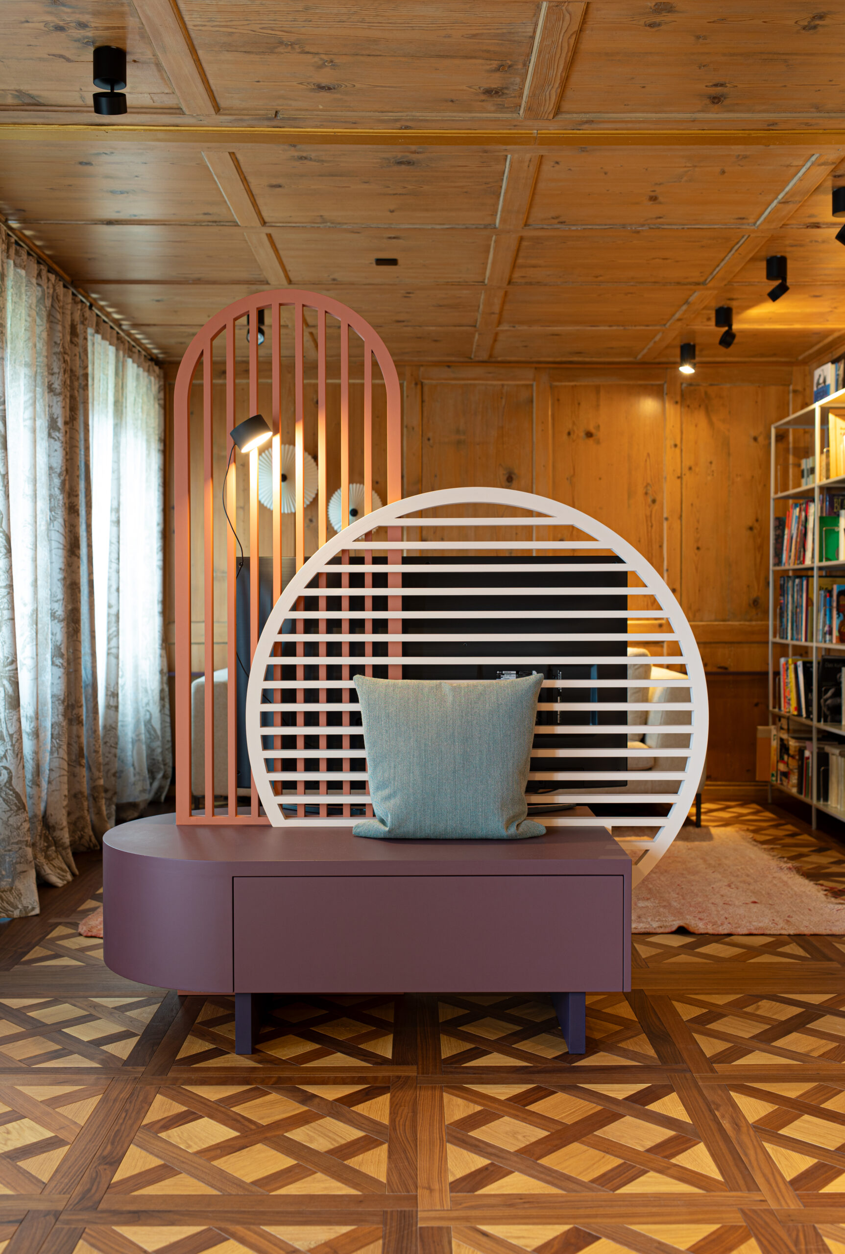 Neue Möbel und Textilien setzen gezielte Akzente, die bewusst im Kontrast zu den historischen Bestandteilen stehen und gleichzeitig neue Kulturen ins Haus bringen. Durch massgefertigte Schreinermöbel aus wertigem Birkensperrholz erhält der Raum Struktur und Funktionalität.