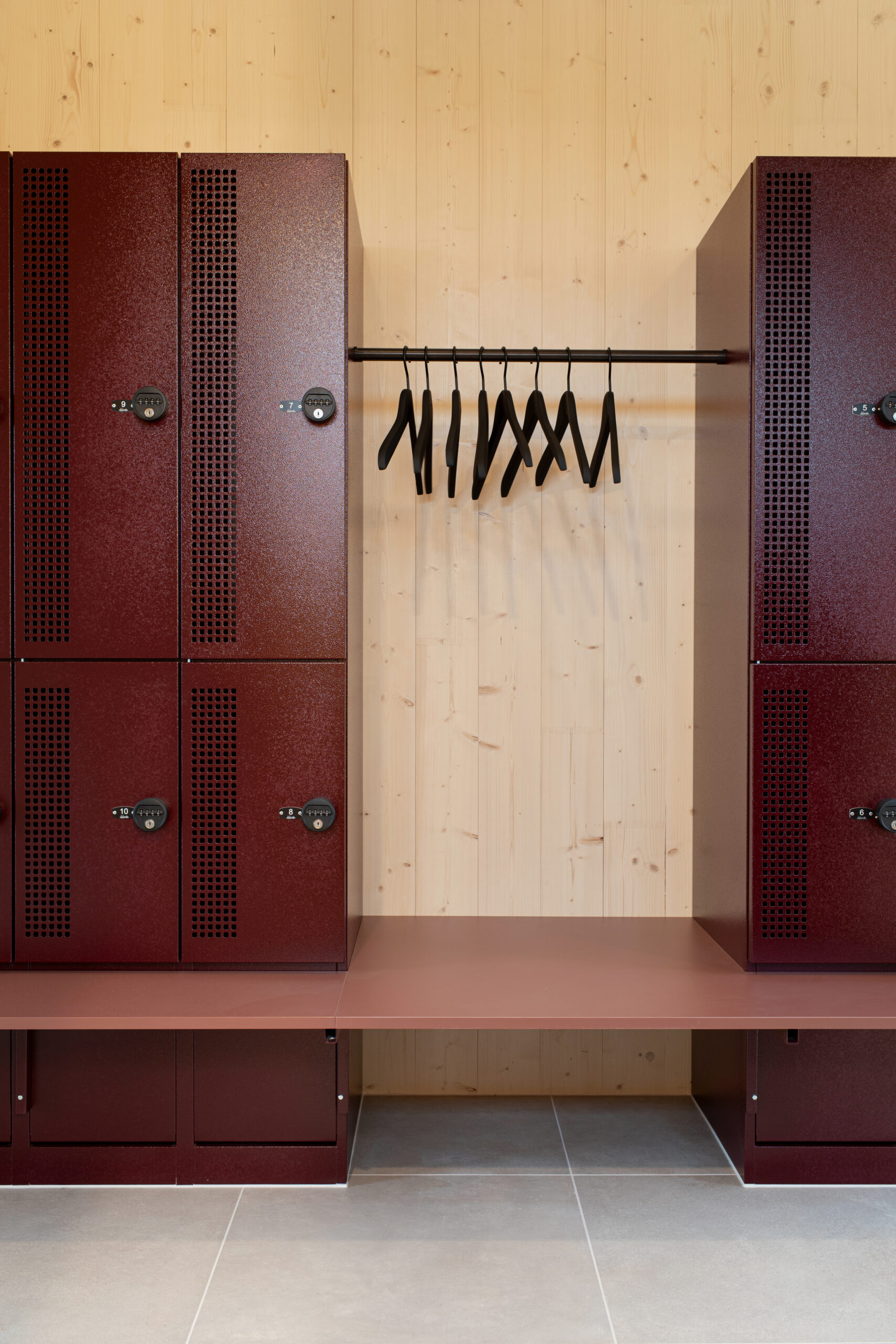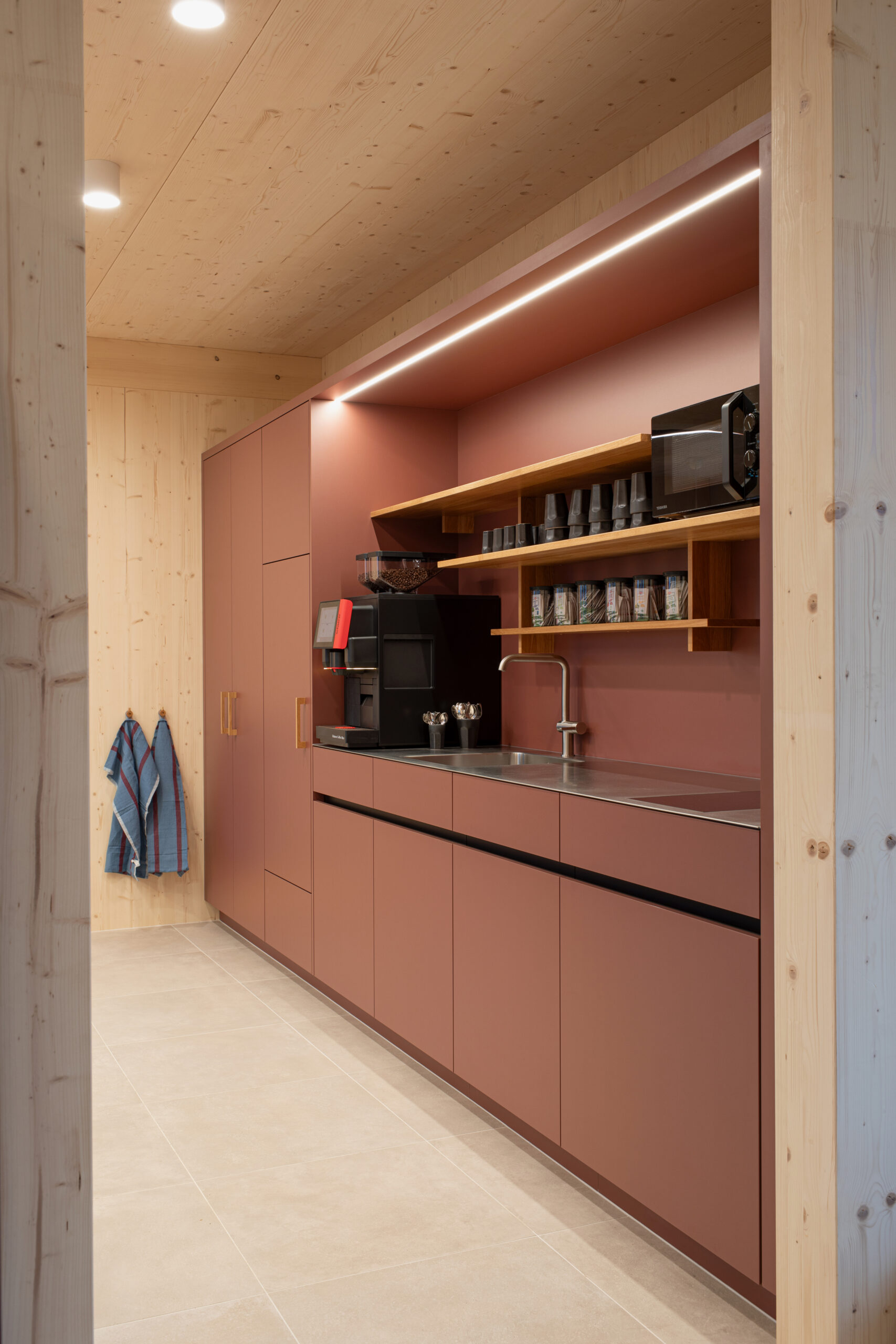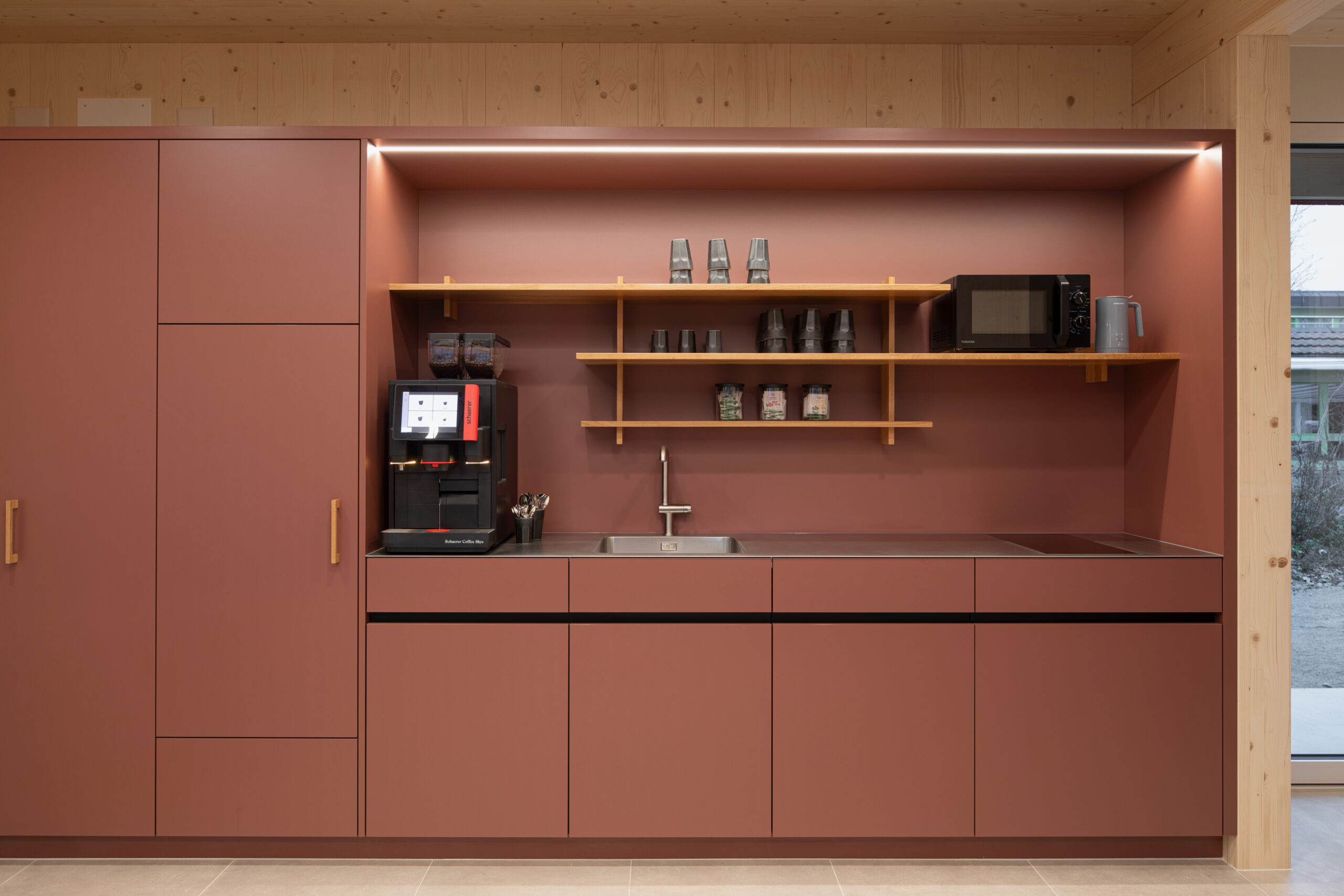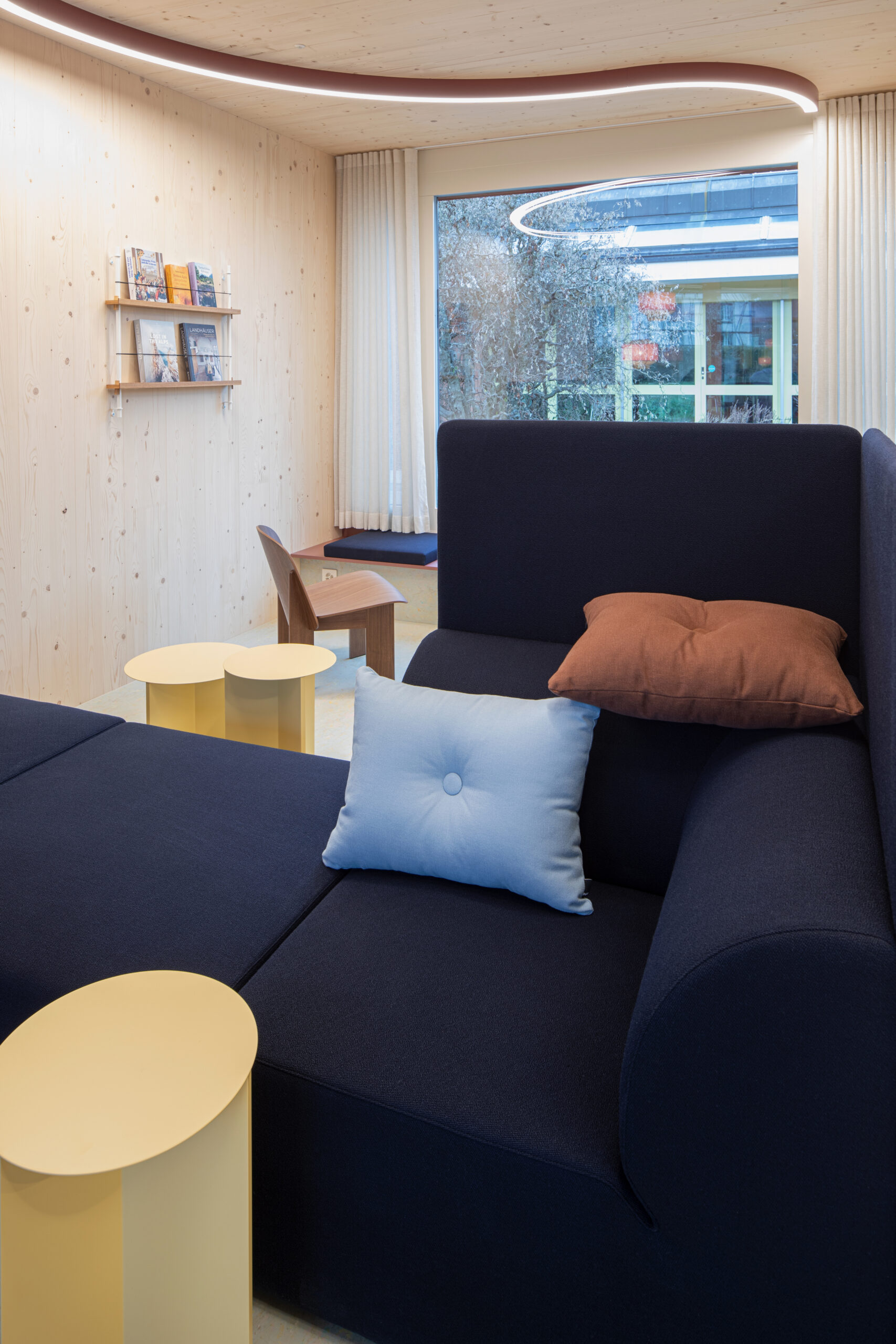 Der Grundriss kombiniert funktionale Bereiche wie Garderobe, Nasszellen und Teeküche mit Bistro- und Loungezonen. Der grosse Gemeinschaftstisch, ein Sofa mit hoher Rückenlehne und flexible Sitzgelegenheiten fördern Austausch und Rückzug gleichermassen.