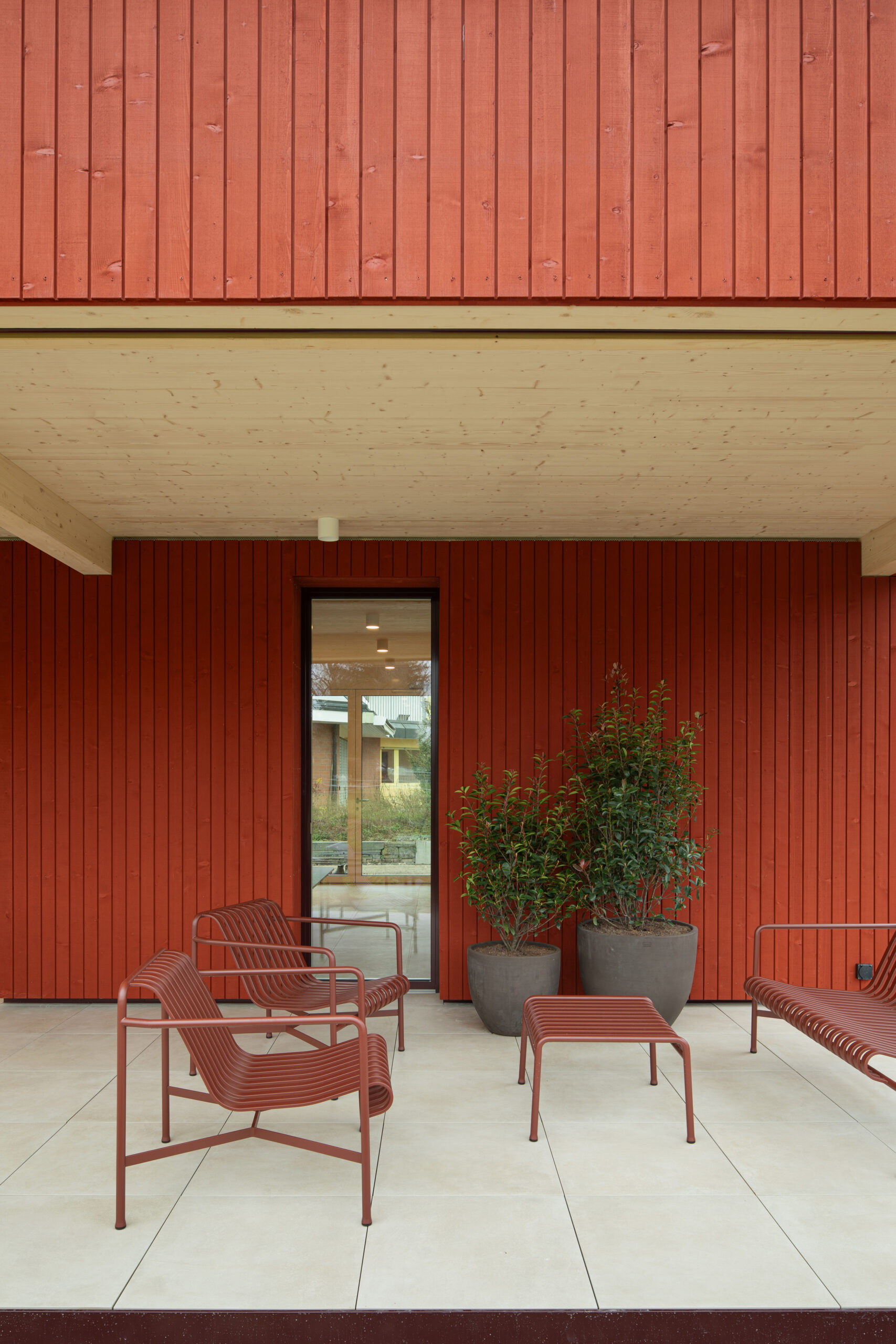 Der neue Pavillon bietet Mitarbeitenden einen flexiblen Rückzugsort mit Südausrichtung und Blick auf die Pferdekoppel. Die grosszügige Terrasse schafft Erholung und Nähe zur Natur.